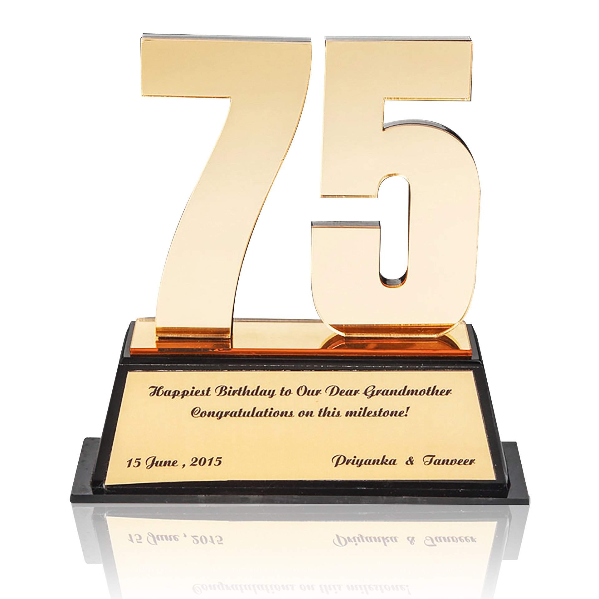 Mark a treasured 75-year milestone with the Golden 75 Milestone Trophy, crafted in glossy gold acrylic and set on a sophisticated black base. Its bold “75” figure and customizable plaque make it a heartfelt tribute for birthdays, anniversaries, or years of service. A perfect blend of elegance and sentiment for a truly golden occasion. Not for sale or reproduction in current form. Call 9820394934 for similar options.